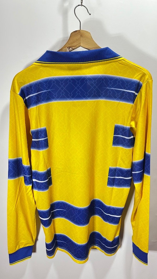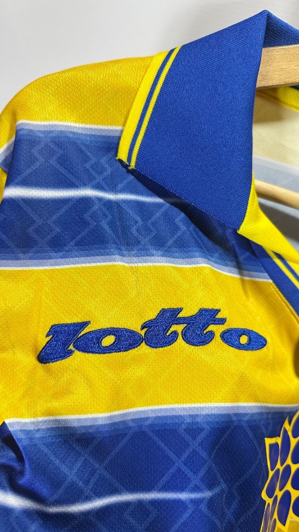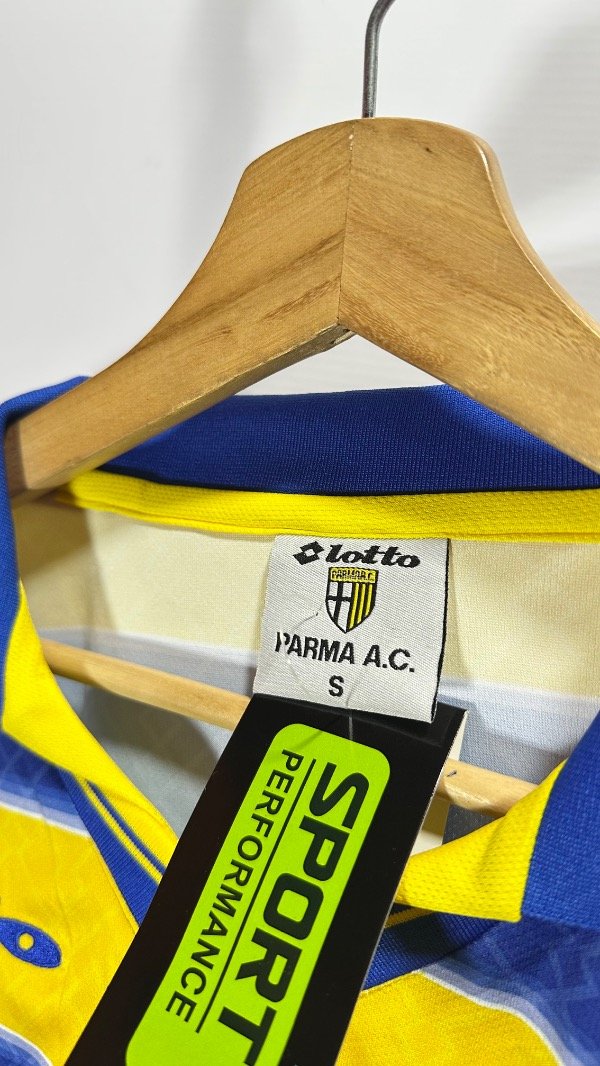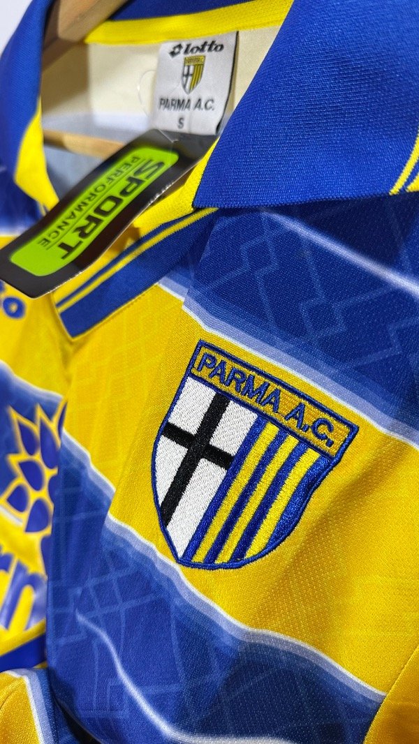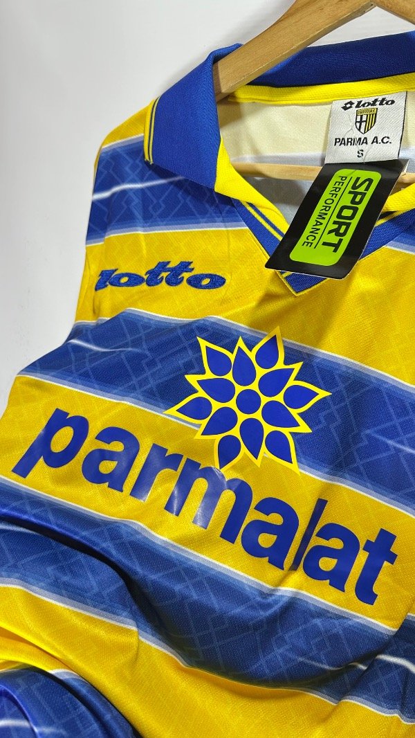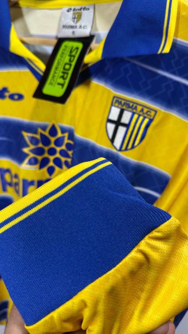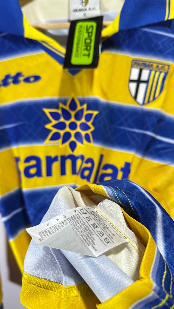 Camiseta del Parma A.C. Titular , temporada 1998/1999 Manga Larga. Importada G5. Con escudo del Parma y marca Lotto bordados de la mejor calidad. Estampado de Parmalat termosellado. Con etiqueta con sus respectivos talles. Idéntica a la original.