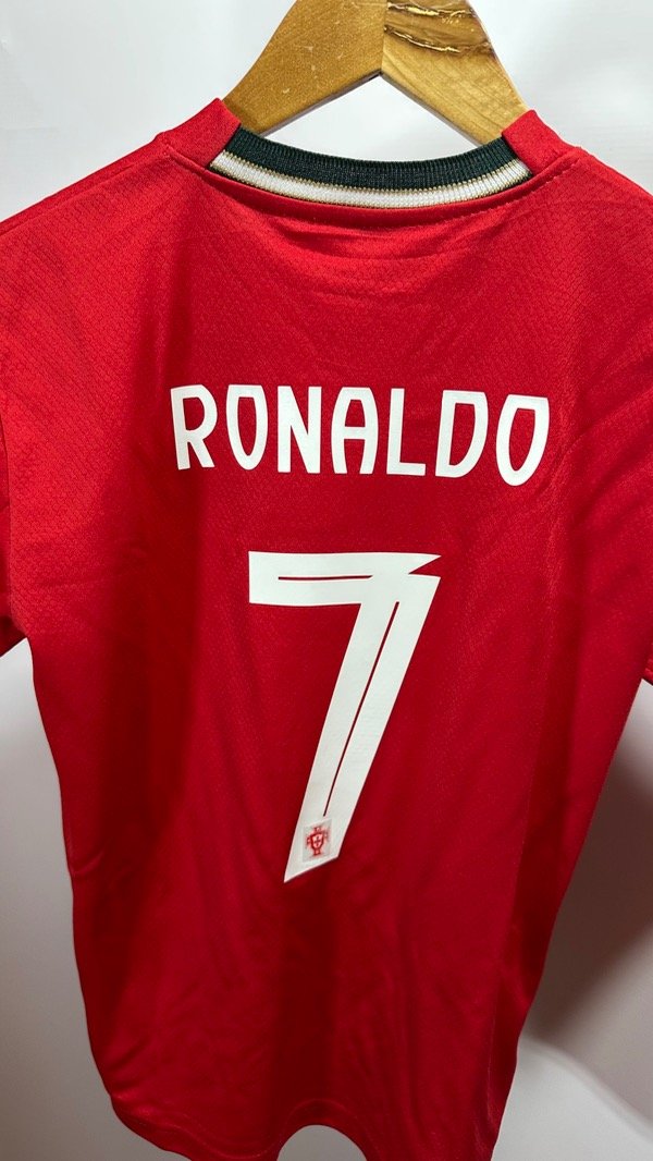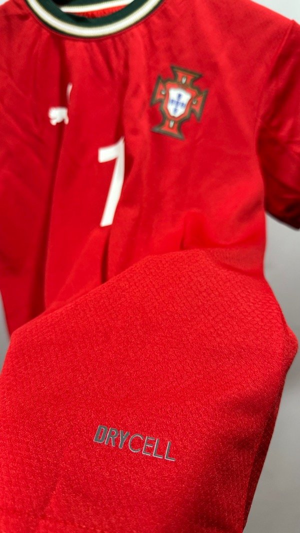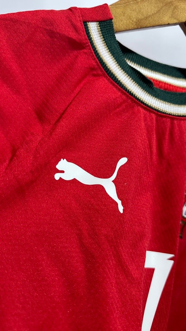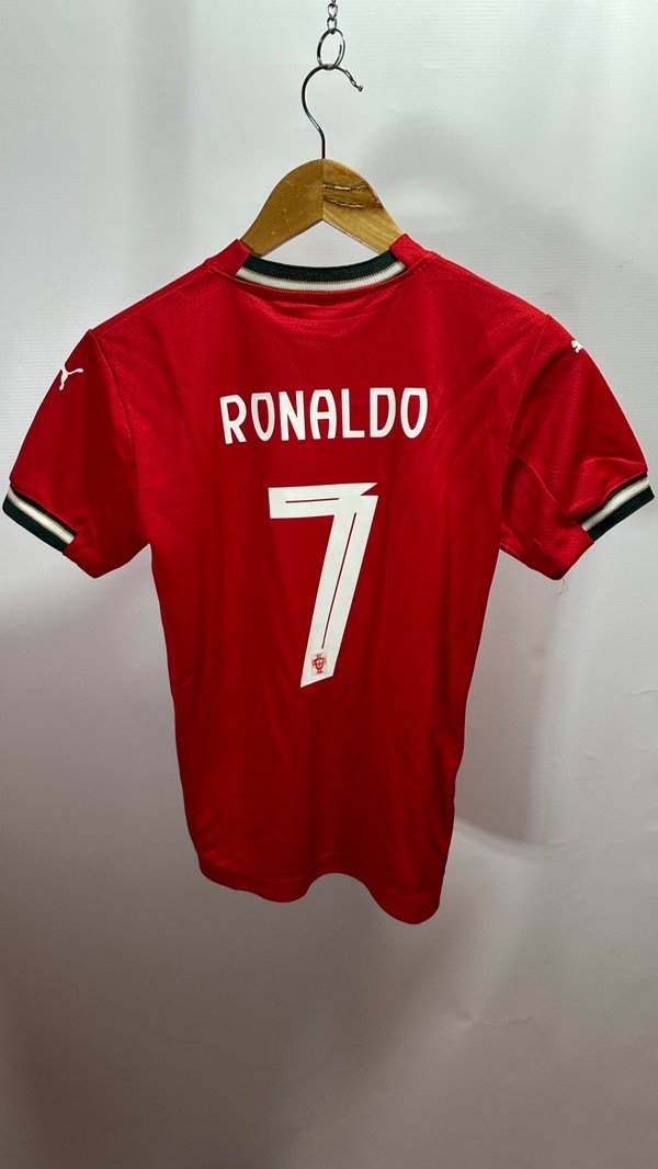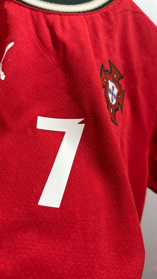 Camiseta de la Selección de Portugal, titular temporada 2025/2026. Posible camiseta del Mundial 2026 !! Con la número 7 en el dorsal de Cristiano Ronaldo . Con escudo termosellados y engomado y estampados de marca Puma y dorsal en vinilo. Corte y confección idéntico al original. Top Quality.