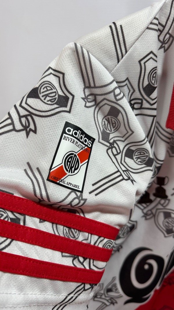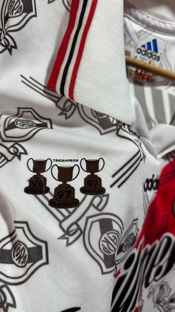 Camiseta de River Plate de la temporada 1996/1997 con escudos impresos en toda la camiseta. Iconico . Con la número “10” en el dorsal que usaba Enzo Francescoli. Con escudo y marca bordados . Estampados en vinilo. Corte y confección idéntico al original.