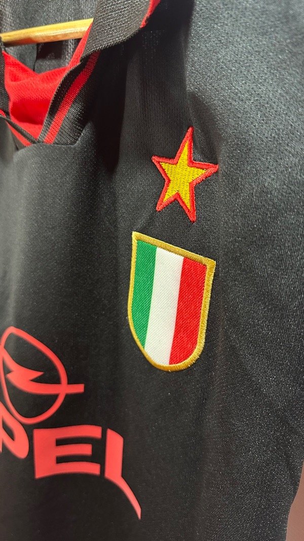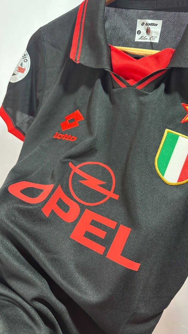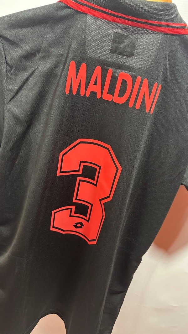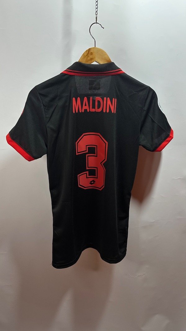 Camiseta del AC Milan de la temporada 1996/1997 alternativa. Con la número “3” en el dorsal del Italiano Paolo Maldini. Con escudo y marca bordados . Estampados en vinilo. Corte y confección idéntico al original.