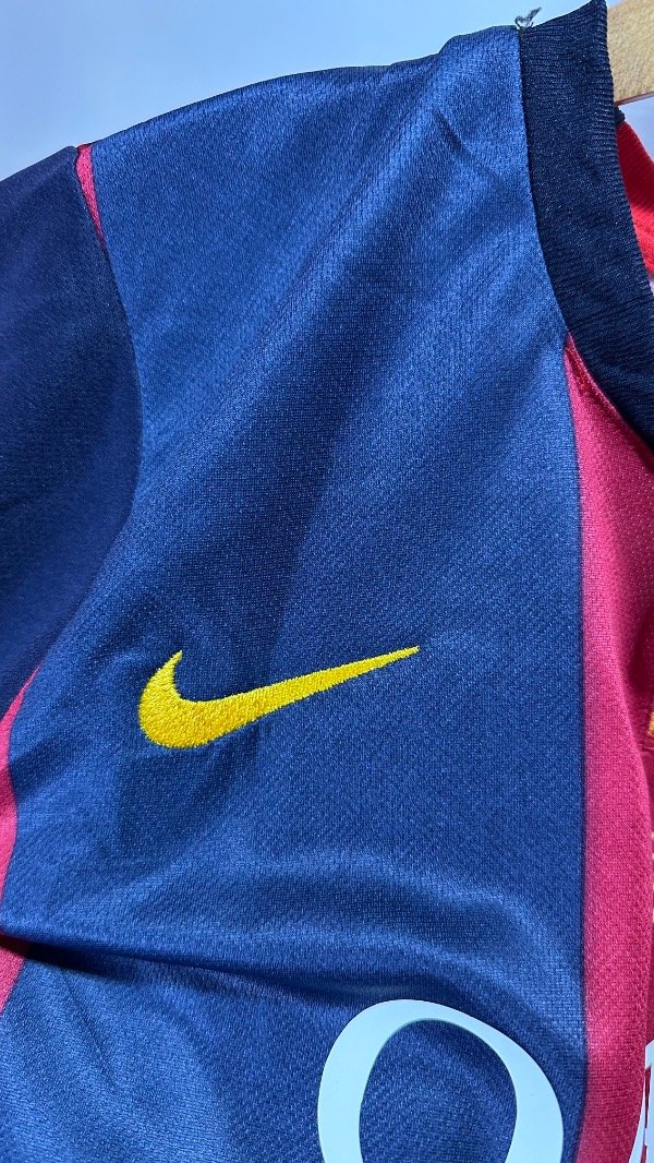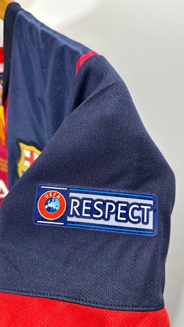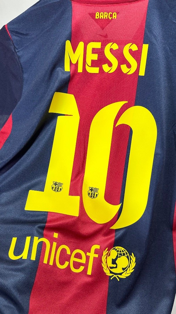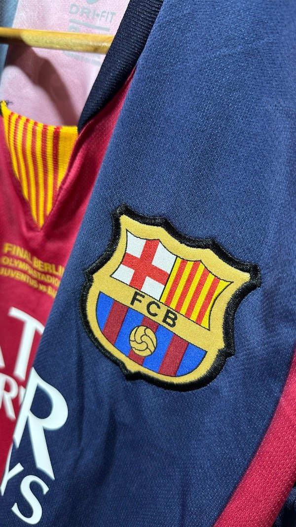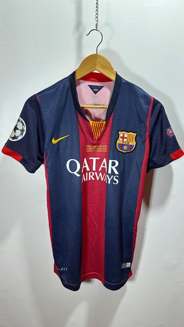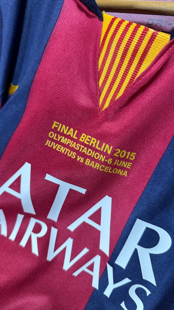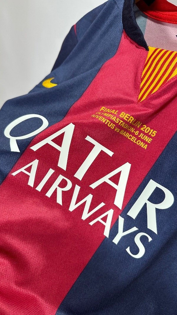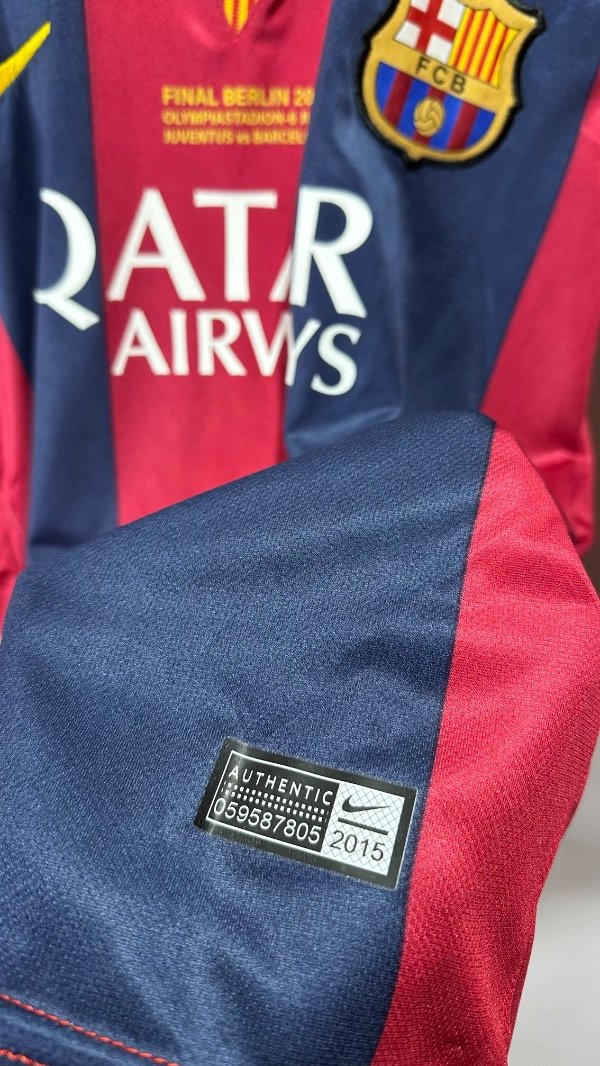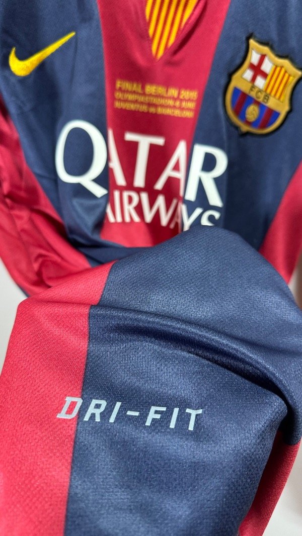 Camiseta del FC Barcelona Titular temporada 2015 , titular oficial de la final de la Champions League en Berlín , vs Juventus . En el cual el Barcelona se queda con el trofeo con un contundente 3 a 1. Con la número “10” en el dorsal de Lionel Andrés Messi. Con escudo y marca bordados. Estampados de la final , marca y dorsal hechos en vinilo. Corte y confección idéntico al original. Full premium .