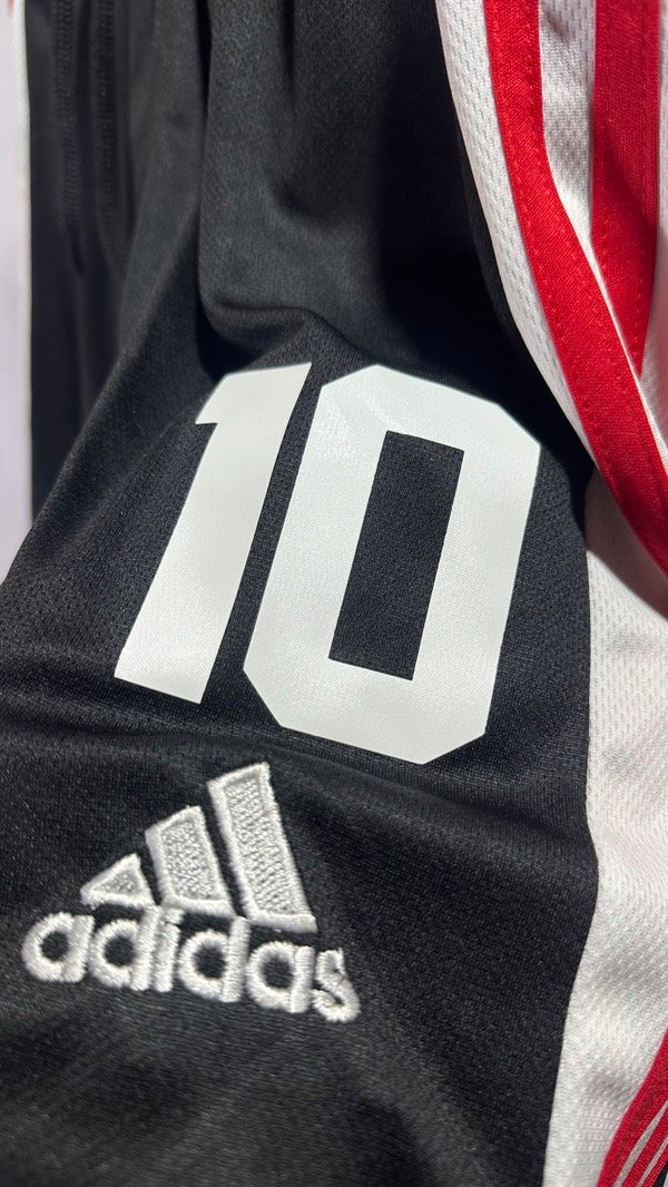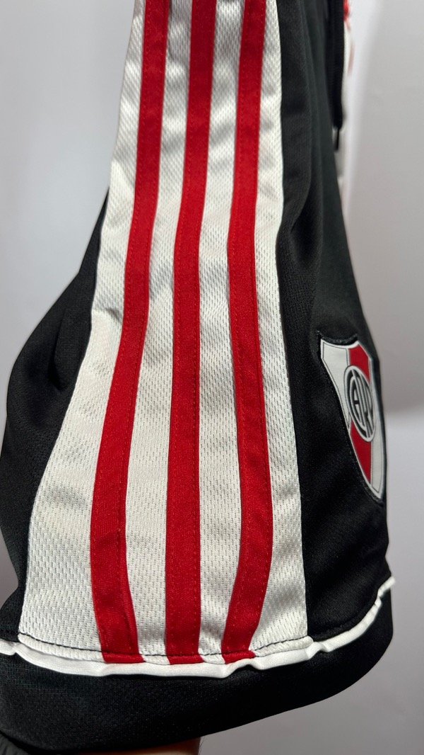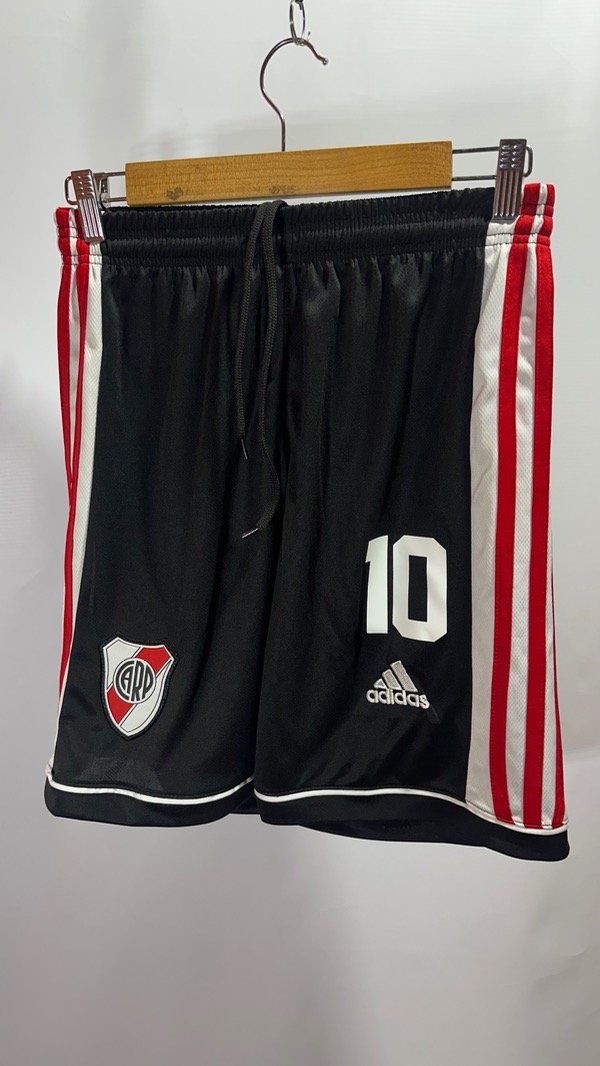 Short de River Plate titular. Temporada 1998. Con escudo de River y marca Adidas bordados. Estampado del 10 en vinilo. 3 líneas rojas en cada lateral cocidas. Cordón ajustable a la cintura. Corte y confección idéntico al original.